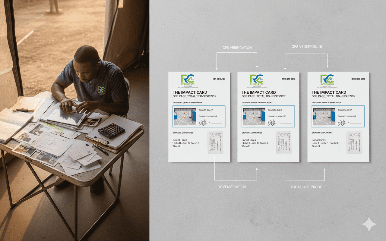 The Impact Card was born, not elegant, but real: GPS-stamped photos, disposal receipts, names of hired locals, signed off by the council. One page. Same for R9,500 or R950,000. Proof isn’t optional. Not here.